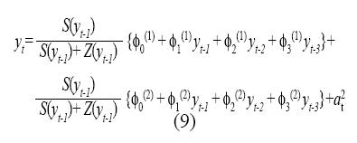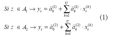 Donde los regresores x(k)t (para k=1,...,U) y la variable de transición z pueden corresponder a rezagos de la serie analizada o a variables exógenas que puedan explicar su comportamiento. Un ejemplo del modelo obtenido es presentado en la ecuación (9). Los dos con-juntos borrosos que cubren el dominio de z pueden especificarse a través de las funciones S(·) y Z(·):