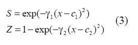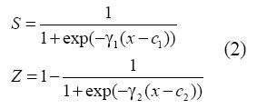 Donde ci es un parámetro que define el punto de inflexión de la función de transición, y γi define su pendiente. Tal como es mostrado por Velásquez et al. (2004), la formulación propuesta en (2) es equivalente a un modelo LSTR o logistic smooth transition regression cuando se hace c1=c2 y γ1=γ2, ya que para la ponderación asignada a cada regla se obtiene que w1=1-w2, de acuerdo con el algoritmo de cálculo previamente descrito.