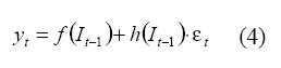 Donde It es la información disponible hasta el instante t. Así, el valor esperado de yt es f(.) mientras h(.) representa la desviación estándar de yt. εt es una variable aleatoria normal estándar. Si f(.) es lineal, se dice que la serie es lineal en la media. Si h(.) es constante, se dice que la serie es homocedástica, o de varianza constante; de lo contrario, se dice que es heterocedástica.