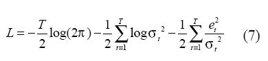 Donde f (.) es definida en (4), Ψ es el vector de parámetros del modelo; y σ2 es la varianza de los residuales, la cual sigue un proceso ARCH definido en (5). Los parámetros del modelo Ψ son obtenidos maximizando el logaritmo de la función de verosimilitud de los residuales: