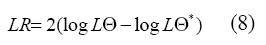 - Sea log L la función especificada en (7); si se tienen dos modelos Θ y Θtales que el segundo es un modelo restringido del primero, el radio de verosimilitud LR se define como: