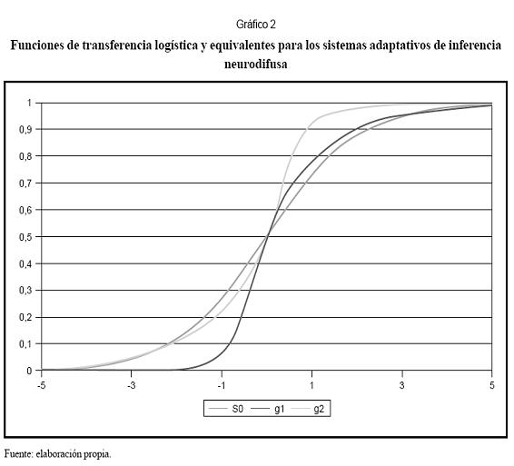 En el Gráfico 2 se presenta la función de transferencia S(.) con γ1=1 y c1=0, y la función equivalente de transición para los ANFIS para c1=c2=0; la curva g1 representa el caso γ1=3 y γ2=1, mientras que la curva g2 representa γ1=1 y γ2=3. Se observa que la función de transición equivalente para los ANFIS no es simétrica, lo que podría, en términos generales, ser una ventaja sobre los modelos LSTR tradicionales, puesto que permite una mejor adaptación del modelo.