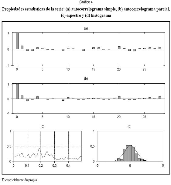 El Gráfico 4 resume las propiedades estadísticas de la serie. La función de autocorrelación simple y la función de autocorrelación parcial (FACP) se presentan en los gráficos 4a y 4b, respectivamente, e indican que la serie se podría aproximar con un modelo AR(P), de orden 2. En el espectro de potencias (Gráfico 4c) no se observa una concentración de energía de frecuencias muy altas.