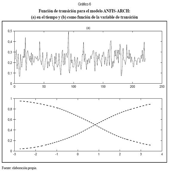 En el Gráfico 3a se presentó la serie analizada. En los gráficos 3b y 3c se presentan las innovaciones estimadas y la varianza en función del tiempo. Se observa que el modelo captura la relación entre las varianzas altas y las innovaciones de mayor magnitud. El Gráfico 6 muestra la función de transición entre regímenes como función del tiempo y la variable de transición (Gráfico 5b). El Gráfico 5a muestra fluctuaciones rápidas de un régimen a otro, lo que evidencia la no linealidad de la serie.