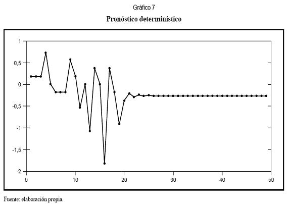 El Gráfico 7 presenta el pronóstico determinístico para la serie; yT+1 se calculó utilizando los datos históricos. Para calcular yT+2 se utilizaron los datos reales hasta yT, y el pronóstico para yT+1. Los restantes valores se calcularon de forma similar. En todos los casos se asume que los residuales son cero. Se observa cómo la serie pronosticada converge rápidamente a un punto de equilibrio donde las entradas y la salida del modelo son iguales numéricamente.