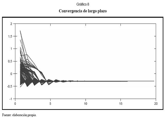 El Gráfico 8 muestra la convergencia a largo plazo del modelo; ella se obtiene al realizar el pronóstico determinístico utilizando diferentes puntos de arranque obtenidos de los datos históricos. En general, los modelos no lineales pueden presentar procesos de convergencia a uno o más puntos estables, procesos cíclicos y procesos divergentes. Es común que, dependiendo del punto de inicio, un mismo modelo presente distintos comportamientos. Para el modelo obtenido se presenta un proceso de convergencia a un único punto de equilibrio, y la velocidad con que el modelo converge a este es aproximadamente constante e independiente del tipo de fenómeno extremo.