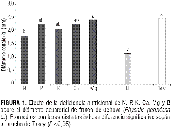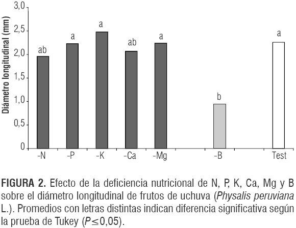 En general, las deficiencias nutricionales, excepto la del boro, tuvieron un bajo efecto sobre la calidad interna de los frutos de uchuva, lo que confirma que la mayoría de los factores que controlan su calidad son fijados genéticamente (Mengel et al., 2001).