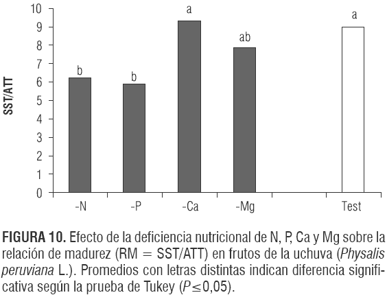 La RM del testigo, 9,0 (figura 10), fue un poco mayor que la reportada por Novoa et al. (2006) en uchuva (8,0). Los tratamientos -N y -P presentaron las menores RM (6,2 y 5,9, respectivamente) (figura 10), debido a que estas defi- ciencias tienden a retardar los procesos de maduración del fruto (Yoshioka et al., 1989; Link, 1980; Marschner, 2002). El Ca que no está involucrado en la maduración del fruto (Ferguson et al., 1999) muestra una RM similar a la del testigo.