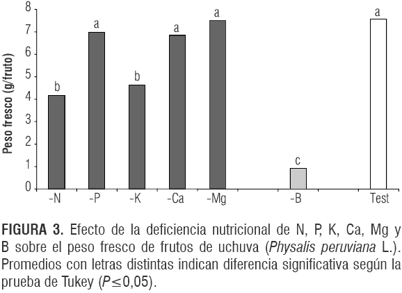 Las plantas deficientes de Ca produjeron un peso fresco similar al de los frutos del testigo, lo que no concuerda con resultados de Cooman et al. (2005) que reportaron en uchuva una reducción del peso usando soluciones nutritivas sin Ca.
