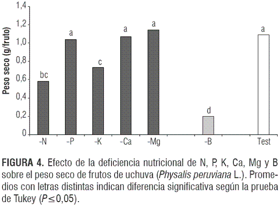 Hubo diferencias altamente significativas en el peso seco de frutos (P<0,0001) (figura 4). Se puede apreciar que, de los elementos mayores, las deficiencias de nitrógeno y potasio afectaron significativamente el peso seco de los frutos en su madurez de cosecha, con valores de 0,579 y 0,736 g/fruto, respectivamente, en comparación con los 1,093 g/fruto que desarrolló el testigo. El efecto perjudicial de la deficiencia de K y N en la solución nutritiva sobre el peso de los frutos es explicable también porque estos dos elementos son los de mayor abundancia en este órgano reproductivo (Osterloh et al., 1996).