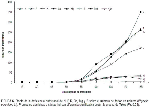 Desde el inicio de la fructificación hasta los 135 días después del trasplante (ddt) los tratamientos -N, -K y -B presentaron los menores valores para esta variable, desarrollando solo 34, 17 y 27 frutos/planta a los 135 ddt frente al testigo que generó 349 frutos/planta (figura 6). Según Fischer y Angulo (1999) el nitrógeno es el elemento que más influye en la disminución de la producción de frutos en plantas de uchuva, afectando su número y tamaño. La cantidad de frutos para el tratamiento -P se vio reducida en el tiempo, desde el inicio de la fructificación hasta 135 ddt, en que se desarrollaron en promedio 169 frutos, lo que significa una reducción del 51,5% frente al testigo. En contraste, los tratamientos -Ca y -Mg tuvieron un comportamiento similar al testigo hasta el día 120 ddt: desarrollaron alrededor de 200 frutos/planta. Solo 135 ddt mostraron diferencias significativas, cuando se presentó una reducción de 25,5% con respecto al testigo. El menor número de frutos concuerda con el poco crecimiento longitudinal de las ramas generativas de los tratamientos afectados por las deficiencias nutricionales en la solución nutritiva, comparados con el testigo (Martínez y Sarmiento, 2008), teniendo en cuenta que la uchuva forma en cada nudo de la rama reproductiva un fruto (Fischer, 2000).