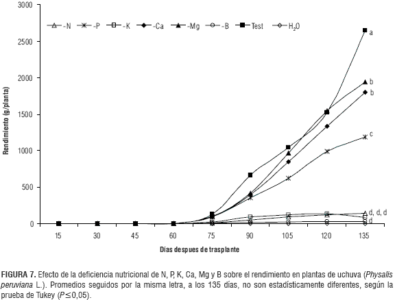 Con respecto al Ca, similares reducciones del rendimiento encontraron Cooman et al. (2005) en uchuva, usando soluciones nutritivas carentes de este elemento.