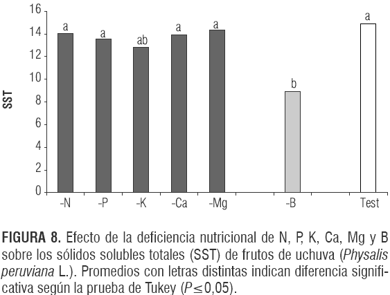 El análisis de varianza para SST mostró una diferencia significativa entre tratamientos (P<0,0014). La ausencia de boro disminuyó significativamente la concentración de grados Brix (8,92) frente al testigo (14,86) (figura 8). Esto, supuestamente, se debe a que el B influye indirectamente el metabolismo de azúcares facilitando el transporte desde las fuentes hacia sus vertederos (Marschner, 2002). Este autor afirma claramente que en condición de deficiencia, la exportación de fotoasimilados desde las hojas se afecta por la falta de actividad vertedero (como es el crecimiento del fruto de uchuva). Aparte del B, el tratamiento -K mostró una tendencia a reducir los SST en el jugo del fruto, encontrándose 2,83 °Brix, que significó un contenido de SST 13,6% menor que el del testigo, pero esta diferencia no fue significativa. En maracuyá un incremento en la nutrición potásica promovió un aumento lineal en la concentración de SST en el jugo del fruto (Carvalho et al., 1999). La deficiencia de nitrógeno no afectó la concentración de los SST lo que concuerda con lo reportado por Link (1980) para el manzano.