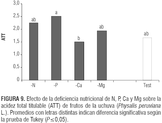 En el análisis de varianza la F significativa (P<0,0102) evidencia que existió efecto en la ATT de los frutos a causa de los tratamientos; sin embargo, no hubo diferencias signi- ficativas entre el testigo y las deficiencias nutricionales. El tratamiento -Ca presentó un menor contenido de ácidos que frutos en plantas con deficiencias fosfóricas (figura 9). En contraste, Link (1980) encontró en diferentes variedades de manzano, que recibieron fertilizaciones bajas en nitrógeno, concentraciones altas de ATT y concluyeron que la descomposición de los ácidos en el fruto es más lenta con poca fertilización nitrogenada. Singh y Pandey (1977) detectaron en uchuvas la ATT más baja en plantas que recibieron fertilización de N-P-K baja comparada con aquellas que recibieron dosis altas.