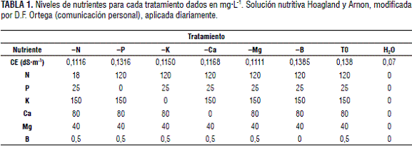 Para evaluar el efecto de los tratamientos se utilizó la solución de Hoagland y Arnon modificada por D.F. Ortega (comunicación personal) (tabla 1), la cual se mezcló para generar soluciones madre en tanques de 40 L; esta se aplicó dos veces por día mediante regadera. Al agua de riego se le realizó un análisis fisicoquímico para verificar que fuera apta para el estudio.
