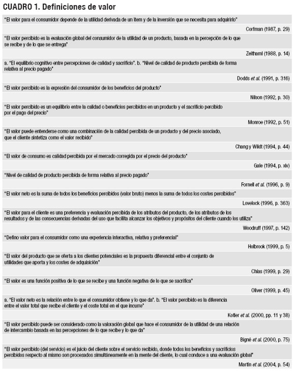 Una de las mayores controversias de la investigación del valor es su omnipresencia en la literatura de gestión y de marketing, lo que provoca una cierta polisemia del concepto que dificulta a veces una aproximación rigurosa. Lo cierto es que la existencia de tantas definiciones de valor hace difícil un discurso científico (Day y Crask, 2000) y el valor acaba convirtiéndose en cualquier cosa ofertada en los mercados (Oliver, 1999). En la revisión propuesta en Gallarza y Gil (2006) se registran más de 29 definiciones de valor y valor percibido, de las que mostramos una representación de las más nombradas en la literatura (ver cuadro 1).