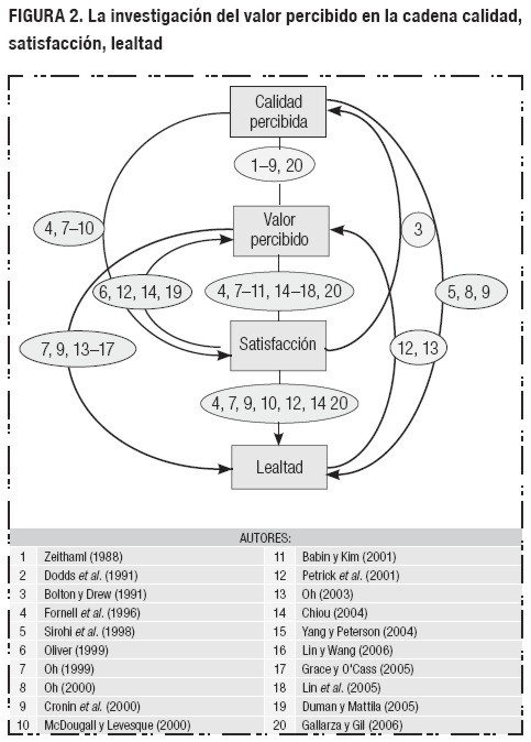 La figura 2 recoge una revisión de los trabajos teóricos y empíricos más significativos que han estudiado las relaciones entre variables clave del estudio del comportamiento del consumidor: calidad, valor, satisfacción y lealtad; salvo honrosas excepciones como Oliver (1999), el valor percibido tiene un papel fundamental como consecuencia de la calidad de servicio y como antecedente de las evaluaciones de satisfacción del cliente. El interés por la lealtad es un último eslabón de una cadena que resulta ser una buena radiografía del comportamiento moderno de consumo, abarcando esta última tanto comportamientos de recompra (lealtad conductual) como de recomendación (lealtad afectiva). Esta cadena es un consenso importante en la literatura de marketing de servicios y de comportamiento del consumidor, al que hemos tardado varias décadas en llegar. No obstante, también creemos que se precisarán mayores y mejores esfuerzos por validar esta cadena de efectos, especialmente en la relación entre satisfacción y valor, lo que necesariamente llevará a replantear la bondad de los modelos de ecuaciones estructurales y la idoneidad de las diferentes técnicas utilizadas para su contrastación (EQS, PLS, LISREL u otros).