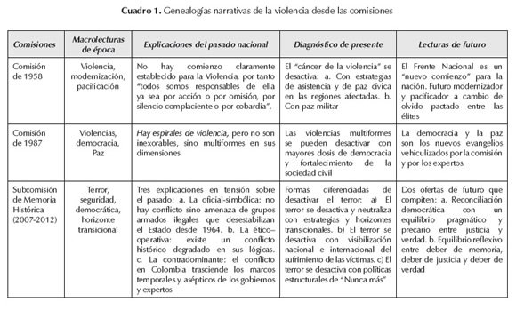This article is aimed at discussing how the experts and the commissions for the study of violence in Colombia generate frames for interpreting violence. In particular, the article focuses on the analysis of the ''Comisión de Expertos'' of 1987, and the ''Subcomisión de Memoria Histórica'' (2007-2012). The article critically addresses two set of ideas on the commissions for the study of violence following a socio-historical approach: First, they research the causes of violence and offer manners to left behind the sequels of violence, but simultaneously they tend to impose particular narratives on the past. Second, they make public the narratives on a violent past, even if their narratives are questioned by alternative researchers that consider them useful for preserving the status quo.