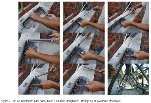 La flejadora y la grifa: La flejadora, se elabora con cuatro láminas gruesas de hierro, llamadas platinas, dos planas y dos angulares rectas. Las planas son separadas paralelamente a 50cm (mediciones no estándares) y las platinas angulares se colocan sobre ellas perpendicularmente y se sueldan. A las planas, se les hace un orificio en cada extremo, para ser clavadas temporalmente a una tabla gruesa. Al soldarse, la separación de las platinas superiores forman un canal no muy ancho, donde se meten las varillas para ser dobladas con el tubo de flejar. Previamente, a una de las platinas angulares se le practica unos carcaones o muescas, que sirven para hacer los doblajes estimados, que producen simetría. Para hacer los carcaones, se miden y se hacen las marcas con lápiz rojo y luego son cortadas con segueta. Cada carcaón, se coloca a distancias de 10, 15, 20, 25, 30 y 35cm. Estas distancias, entonces, serán heredadas por las longitudes de los flejes, que se han de usar para columnas o vigas de diversos grosores. Con una flejadora, se pueden hacer flejes o estribos (triángulos, eses (nervios) y cuadrados), al doblar segmentos de 50cm de varillas de 1/4 o 3/8. Como la varilla de 1/2 (media) no entra en la flejadora, pues se debe garantizar que las varillas de 1/4 y 3/8 no queden flojas o no tengan "juego" para optimizar su doblaje, entonces, se dobla con una grifa. El doblaje inicial, a veces, se hace hasta con tres varillas, que permite acelerar el proceso. La grifa, se hace con un metro de una varilla de una pulgada; en sus puntas hay una U, que si las uniéramos formarían un ángulo recto; esta gruesa varilla es doblada en un taller metalúrgico. Tanto la flejadora como la grifa tienen sus propios tubos de flejar. La figura 2 muestra el uso de la flejadora.
