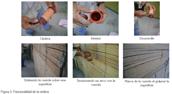 La cimbra: Es un instrumento geométrico semi ejecutable, que sirve para trazar rectas de 3 hasta de 20m, que tiene una extraordinaria diferencia de una regla o codal y es que "ella misma", a partir de una tensión a la cuerda que incluye, marca la línea sobre paredes o pisos. En una clase de geometría, el compás es el único instrumento semi ejecutable, pero la diferencia radica en que éste solo permite trazos curvos y, la cimbra, rectos. Sin duda alguna, la diferencia de los dos instrumentos radica en el tipo de superficies de trabajo, pues el compás, generalmente, se emplea sobre hojas, mientras que la cimbra sobre paredes o pisos. Esto motiva para preguntar: ¿acaso no es posible trasladar la clase de geometría a otras superficies u otros lugares? La figura 3 muestra el proceso de cómo marcar una línea roja sobre una superficie cualquiera, usando la cimbra.
