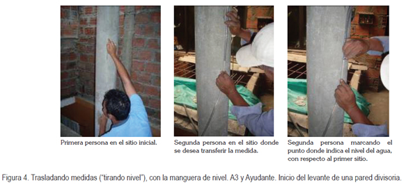 Inicialmente, se hace una marca que servirá de referencia; luego, una persona hace coincidir la "burbuja" (que no existe, pero es uno de los extremos del agua que está al interior de la manguera) con dicha marca, no sin antes de que esta burbuja se haya movido varias veces de arriba a abajo y viceversa; entonces, el Ayudante también sube y baja la manguera de nivel hasta que coincida, tanto la burbuja como la marca de referencia; cuando esto pasa, el Ayudante le hace una señal al Oficial, quien hace una segunda marca en la segunda columna y, justo allí, queda una marca que está a nivel de la primera. Este proceso puede durar alrededor de 40 segundos. Cuando el Oficial hace la marca toma el nivel de mano y traza, sobre dicha marca, una línea sobre la columna. La figura 4 muestra el proceso de transferir una medida de una columna a otra.