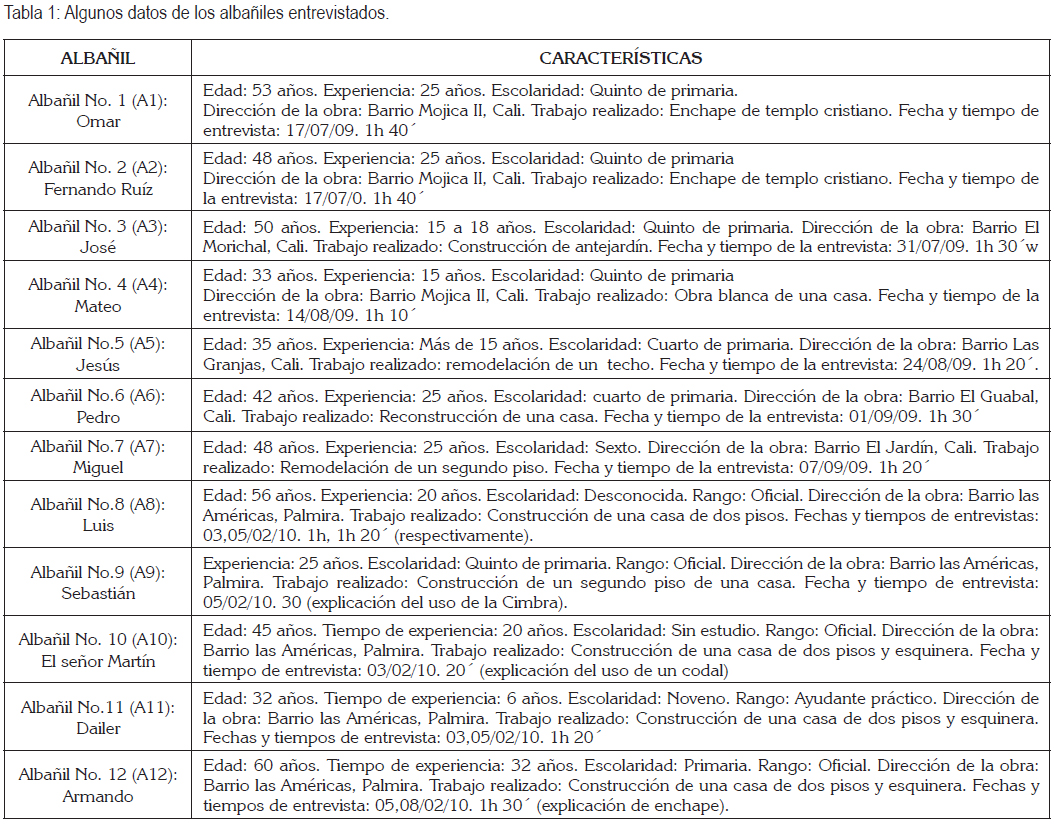 Los nombres de los albañiles fueron cambiados y se nombraron A1, haciendo referencia al primer albañil y, así sucesivamente. Se tuvo en cuenta a Goetz &LeCompte (1998), y se empleó la metodología que admitiera la utilización de una pluralidad de instrumentos (entrevistas, grabaciones, fotos digitales, apuntes de campo), permitiendo así la recolección de datos y posibilitando la construcción y la reconstrucción de hipótesis, además de precisar, modificar y profundizar en el objeto de investigación. Por cada albañil entrevistado, se hacían las correcciones para abordar el próximo albañil, pues el Oficial temía en ciertas ocasiones por la llegada del Maestro de Obra y por el retraso a la construcción que podía implicar dar la entrevista; los Ayudantes, por su parte, en ciertas ocasiones, delegaban la "verdad" al Oficial. El trabajo fue de carácter etnográfico; se usaron entrevistas semi estructuradas, la observación fue participante, salvo en aquellos casos donde no fue posible; algo similar a lo establecido por Pardal (2008).