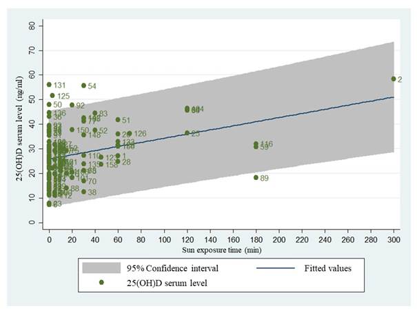 Figure 1 Linear regression of Vitamin D according to time of sun exposure. Linear regression of the relationship between sun exposure (in minutes) with vitamin D levels (in ng/ml), and dispersion of the study data in green.