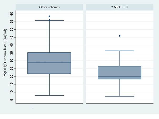 Figure 2 Linear regression of Vitamin D levels when there is use of 2 NRTIs + II vs other types of antiretroviral therapy