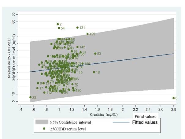 Figure 3 Linear regression of Vitamin D according to serum creatinine levels. Linear regression of the relationship between creatinine (mg/dL) with vitamin D levels (in ng/ml), and dispersion of the study data in green. For every 0.1 mg/dL increase in creatinine, VD increases 9 ng/ml.