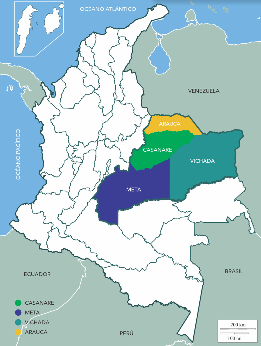 Figura 1 La región de los Llanos Orientales de Colombia, compuesta por los departamentos de Meta, Casanare, Vichada y Arauca