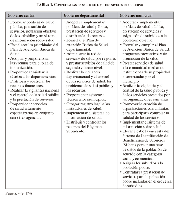 La tabla 1 muestra la adjudicación de las competencias en salud pública, prestación de servicios y la administración de los impuestos para la salud de acuerdo con la legislación.