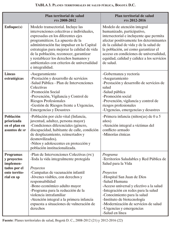 Los planes de desarrollo de 2008-2012 (19) y 2012-2016 (20) presentan los problemas de SP relevantes, el enfoque de salud, las líneas estratégicas, la identificación de la población priorizada en asuntos de SP, y los programas y proyectos que es necesario implementar por el ente territorial (véase tabla 3).