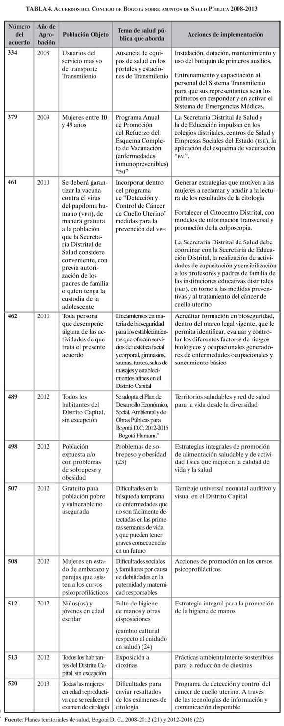 Para ejercer sus funciones, el Concejo Distrital está dividido en tres comisiones: Comisión de Gobierno, Comisión de Hacienda y Comisión del Plan. Dentro de esta última se incluye el tema de salud y por ende ella gestiona la generación de acuerdos que hacen referencia directa o indirecta a los asuntos que comprometen la salud de los habitantes de Bogotá. Se revisaron los acuerdos aprobados por el Concejo de Bogotá a partir del año 2008 y hasta abril del 2013, identificando en ellos el número del acuerdo, la población hacia la cual iban dirigidas las acciones decretadas, los asuntos de SP abordados y las acciones de implementación del acuerdo (ver tabla 4).