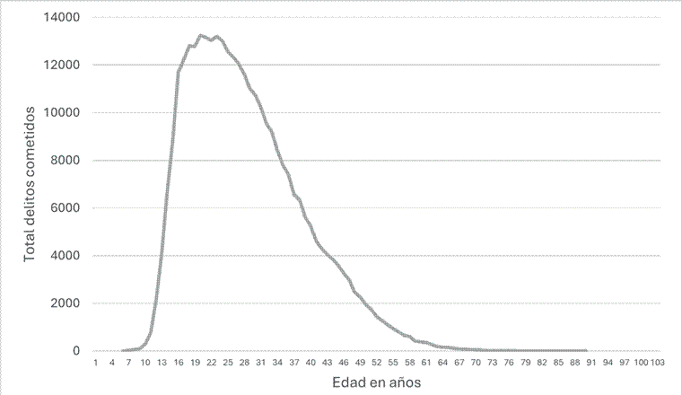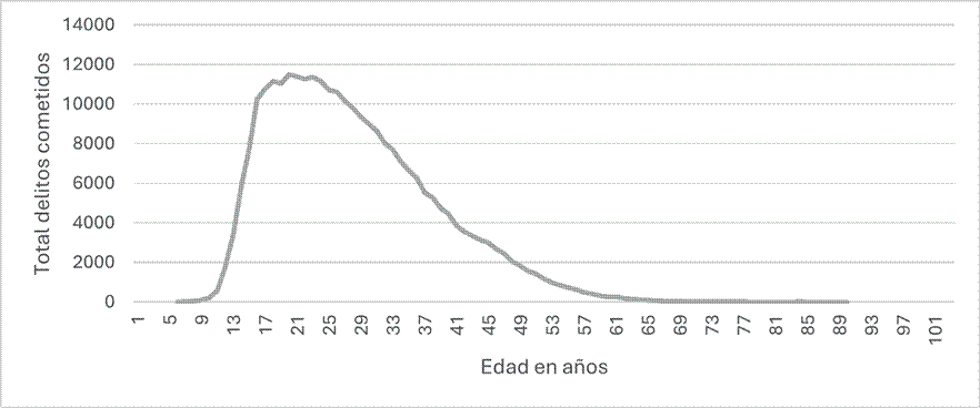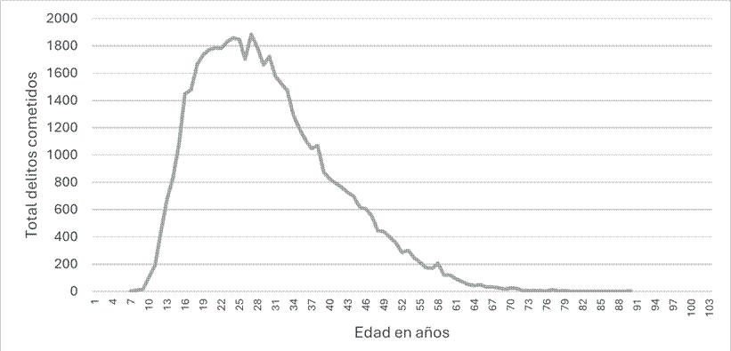 En la figura 1 se observa la curva edad/de- lito general de toda la muestra (n=38.320 personas) distribuyendo el total de los delitos cometidos entre los años 2004 y 2022 (n=340.937) según la edad de los autores (entre 7 y 90 años). Se presenta el total de los delitos acumulados en cada momento de la vida de estas personas. La curva edad/delito muestra un marcado incremento de la actividad criminal a partir de los 11 años, magnitud que aumenta progresivamente hasta alcanzar una máxima frecuencia a los 20 años (n=13.245 delitos) y mantener cierta constancia los siguientes dos años, comenzando recién a disminuir a partir de los 23 años, desde donde se inicia un desistimiento progresivo, constituyéndose el período de entre los 20 y 23 años en el de mayor frecuencia criminal de este grupo de personas.