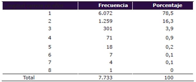 Un 20,2% (7.733 personas) cae bajo la categoría de especialistas, participando en un único tipo de delito de tráfico ilícito de drogas (tabla 2), acumulando un total de 10.980 delitos (solo 3,2% del total) con un promedio de 1,42 delitos (Ds=0,9 y un rango de 1 a 20 delitos, tabla 3) y carreras que se extienden entre 1 y 8 años (tabla 4). Un 43,5 de los especialistas corresponde a personas de género femenino, incluyendo además a 166 extranjeros los que equivalen al 54,8% del total de los no nativos (62 de Colombia, 27 de Venezuela, 21 de Bolivia, 5 de Haití, 4 de Argentina, 4 de Perú, 3 africanos, 2 de Ecuador y 38 de otras no definidas). El 79,8% restante corresponden a delincuentes versátiles responsables de diferentes tipos de delitos que cometieron entre 2 y 8 tipos de delitos diferentes, independientemente del total de los delitos que hayan realizado.
