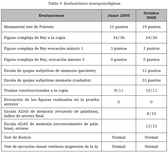 Los síntomas psicóticos (alucinaciones visuales) desaparecieron. De hecho, se presentaron únicamente durante el síndrome mental orgánico tipo delírium vivido por la paciente en los estadios iniciales de la enfermedad. Entre junio de 2005 y octubre de 2006, la paciente fue estudiada dos veces con pruebas neuropsicológicas, realizadas por profesionales diferentes. En la Tabla 4 resumimos sus resultados.