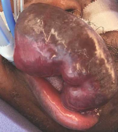Acquired angioedema is a rare disorder that is characterized by deficiency of C1 inhibitor, a regulatory protein which predominantly controls formation of bradykinin from high molecular weight kininogen. Its deficiency leads to excessive bradykinin generation predisposing patients to develop recurrent attacks of bradykinin-mediated angioedema. Attacks are triggered by trauma or psychological stressors and often involve the upper airway and larynx.1,2 The accompanying image demonstrates prominent angioedema of the lips during an acute attack that occurred intraoperatively (Fig. 1).