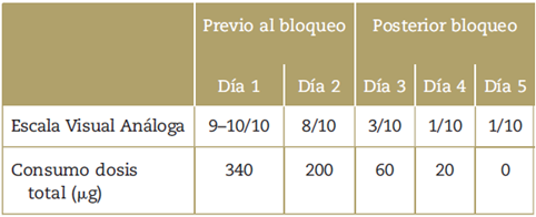 Durante las primeras 48 horas del postoperatorio, presentó dolor de intensidad muy severa, Escala Visual Análoga (EVA) 8-10 predominante en hemitórax izquierdo, que moduló parcialmente con sistema PCA, y registró consumos de fentanil de 540μg en 48 horas (Tabla 1). Además, se documentó una atelectasia pulmonar izquierda, interpretada por el médico tratante como complicación secundaria a patrón respiratorio superficial por dolor. Simultáneamente, presentó nauseas, vómito y alucinaciones, que se consideraron efectos adversos por el uso de opioides. Ante lo anterior, se decidió al tercer día del postoperatorio hacer un bloqueo ESP de rescate con implante de catéter interfascial.
