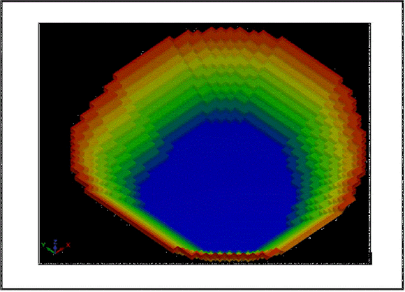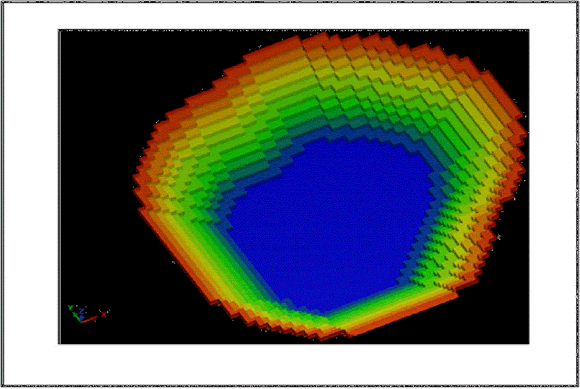 Los resultados pueden ser exportados a un archivo de Autocad con formato X, Y, Z, el cual puede ser utilizado en un programa de generación de superficies donde se puede ver el pit final, en este caso se han usado los resultados obtenidos con UPL para la optimización del modelo de bloques hipotético mediante los métodos de Lerchs-Grossman y cono flotante. Se han generado sus respectivas superficies, las cuales se muestran a continuación en la figura 3 y 4 respectivamente.