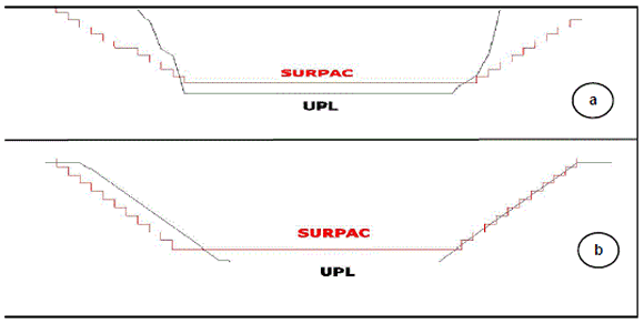 Figura 8: Perfil N-S (a) y E-W (b); Pit cono flotante Surpac vs UPL