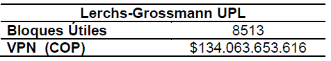 Tabla 1. Datos arrojados por la macro UPL para el algoritmo de Lerchs-Grossmann