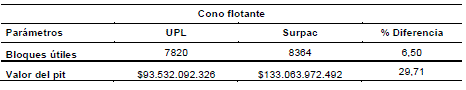 E. Surpac permite al usuario definir el número de interacciones a realizar, a diferencia del UPL el cual las trae por defecto lo que permite asegurar que los resultados arrojados por Surpac son de mayor confiabilidad en el caso del cono flotante donde la diferencia de bloques útiles respecto a UPL fue de alrededor del 7% y el valor del pit del 30%.