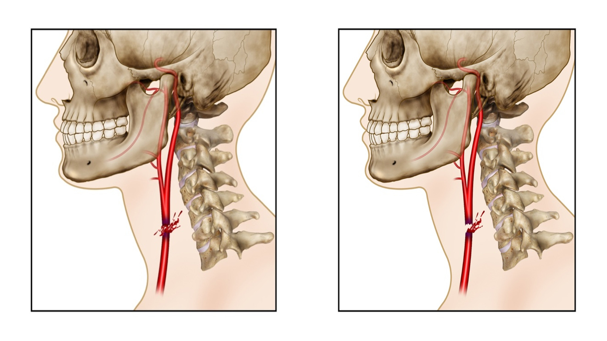 La angiotomografía debe ser usada para clasificar la extensión de la lesión que puede ser una perdida parcial o completa de la continuidad vascular, pseudoaneurisma y/o disección de la íntima. Estos parámetros van más allá del sistema de clasificación para trauma cerrado. Si una oclusión vascular esta con un polígono de Willis permeable, el manejo conservador no quirúrgico está recomendada junto con terapia antiagregante/antiplaquetaria para reducir el riesgo de embolia cerebral y subsecuente accidente cerebrovascular. Si la permeabilidad del polígono de Willis no se detecta, la colocación de un stent endovascular debe ser considerado para restaurar la perfusión vascular. Pseudoaneurismas menores de 5 mm deben ser manejados de manera conservador mientras que aquellos que sean mayores a 5 mm requerirán reparo. La angiografía está recomendada cuando la duda persista acerca de la extensión y tipo de lesión después de la angiotomografía y en aquellos pacientes con sangrado cervical o cerebral subclínico persistente. Paciente con trombo intramural, defectos de la íntima y/o disecciones vasculares con flujo distal intacto son candidatos para un manejo conservador no quirúrgico con o sin terapia antiagregante/antiplaquetaria dependiendo de las comorbilidades de cada paciente y su riesgo.