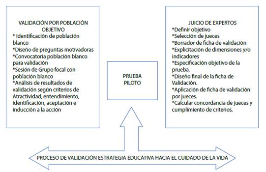 Dentro del proyecto propuesto, destacaba la validación de la intervención educativa tanto por jueces expertos, como por la población objetivo desde la visión de poder entender la utilidad y prácticidad de dicha intervención9. En tal sentido, el grupo investigador reconocio la validación como: “la investigación que se realiza con los representantes de un grupo de personas a los cuales va dirigido un material específico, la finalidad es que ellos opinen sobre los instrumentos antes de que éstos ingresen a la etapa de manufactura”10, donde se incluye “la validez de expertos o face validity, la cual se refiere al grado en que aparentemente un instrumento de medición mide la variable en cuestión, de acuerdo con “voces calificadas”. Se encuentra vinculada a la validez de contenido y, de hecho, se consideró por muchos años como parte de ésta. Hoy se concibe como un tipo de evidencia distinta11. Con base en lo anterior, el objetivo de la investigación fue Estimar la validación de la estrategia educativa “Hacia el cuidado de la vida” a través del juicio de expertos y de su población objetivo.