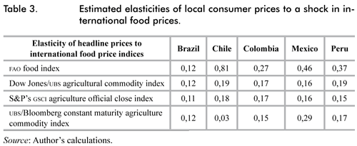 Our results suggest that the elasticity for headline prices appears to be a linear combination of the elasticities for food and core prices. This can be seen in Table 4, which plots the elasticities of food and core indicators to a shock in the FAO Food Index, along with the corresponding elasticity of headline prices as estimated in our base models. It can be seen that, in every country specific case, the elasticity of headline prices falls between that of the food and core indicator used, except in the case of Chile, for which an estimate of the elasticity of its food prices to international food price shocks cannot be calculated, given that its particular food indicator's impulse response is not statistically significant at any horizon. It should be pointed out once again that indicators for Colombia represent the only case in which the food and core indicators are complimentary and together make up the total CPI. In this case, a linear combination assigning the elasticity of food prices a weight of 28.21%, which is the weight of the food component in the total CPI basket, and of 71.79% (its compliment) to the core indicator's elasticity yields a result of 0.271, which is very similar to the 0.267 elasticity estimated using our base headline model. This example supports our claim that the elasticity for headline prices using our base models is a linear combination of the elasticities for food and core price indicators.