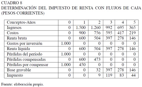 En el sistema de flujos de caja contemplado en el ejemplo, se produce una pérdida fiscal significativa en el primer año y ella requiere dos períodos más para ser liquidada con las utilidades brutas del proyecto. Este aplazamiento de la deducción de los gastos por inversión, sin que se reconozca en su actualización la tasa de descuento relevante para las firmas, produce una evidente subvaluación de las pérdidas, una consecuente sobrevaloración de las utilidades netas y en definitiva un mayor impuesto que no recae sobre la renta sino sobre la inversión.