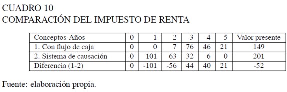 El valor presente obtenido empleando los flujos de caja revela que el proyecto tiene una tasa de retorno de 36,1%; sin embargo, el sistema de causación sugiere que la rentabilidad es mucho más alta. El punto fundamental que se deriva de esta comparación es que los dos métodos de registro no son financieramente equivalentes y si bien, los flujos de caja se emplean para estimar la rentabilidad de los proyectos, los impuestos se liquidan con base en el sistema de causación.
