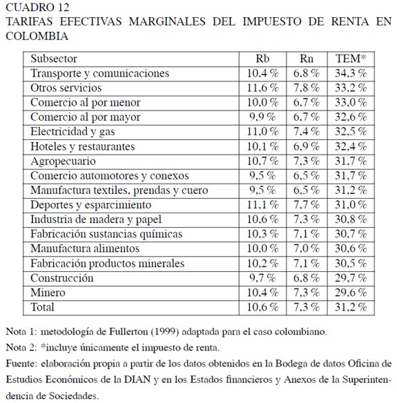 Las TEM calculadas en el año 2006, considerando únicamente el impuesto sobre la renta para las empresas vigiladas por la Superintendencia de Sociedades son positivas para todos los subsectores considerados. Esto implica que el sistema tributario colombiano (Ley 1111 de 2006) contiene un impuesto implícito a la inversión, que difiere ampliamente entre subsectores económicos.