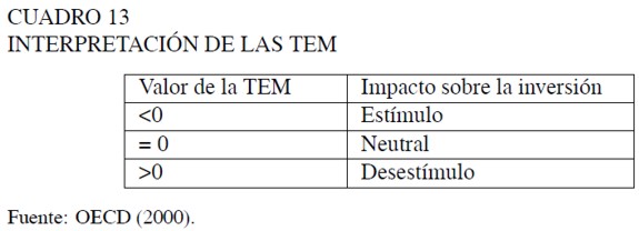 Una TEM negativa indica que el sistema tributario en equilibrio subsidia la inversión, puesto que el valor presente de las deducciones fiscales excede el precio de compra del activo. En oposición, cuanto más elevadas sean las TEM con respecto a cero, mayor es el desincentivo del sistema tributario sobre la inversión (OECD, 2000).