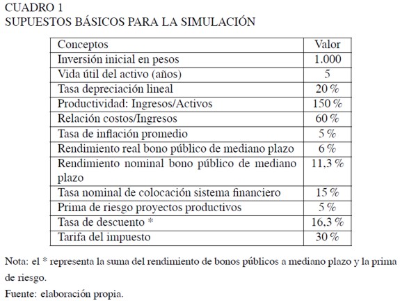 Para esclarecer la afirmación de que en el impuesto de renta existe un gravamen implícito a la inversión, se construye en esta sección un ejemplo que refleja la senda temporal de un proyecto productivo. En el Cuadro 1 se consignan los supuestos que se emplean en la construcción del ejercicio.
